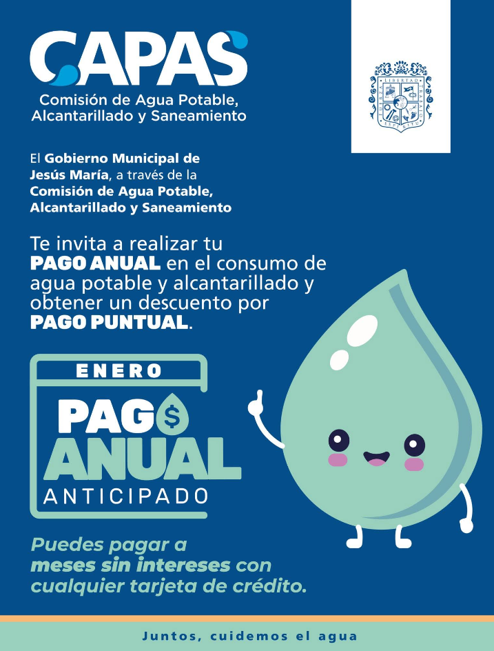El Gobierno Municipal de Jesús María, a través de la Comisión de Agua potable alcantarillado y saneamiento CAPAS, invita a la ciudadanía a aprovechar el programa de pago anual anticipado del servicio de agua potable, un esquema que apoya la economía familiar, ya que al realizar el pago antes del 31 de enero se otorga un mes gratis y un 10 por ciento de descuento adicional.