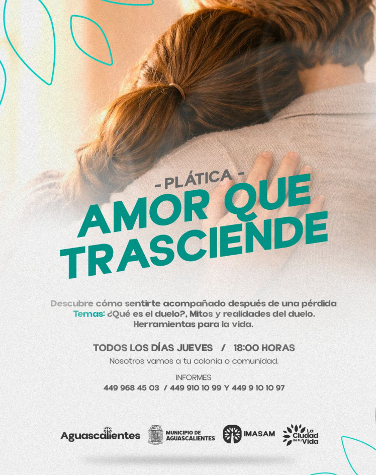 El Instituto Municipal de Salud Mental de Aguascalientes (Imasam) invita a las pláticas gratuitas enfocadas en temas de duelo “Amor que trasciende” dirigidas a la población interesada en temas relacionados a una pérdida.